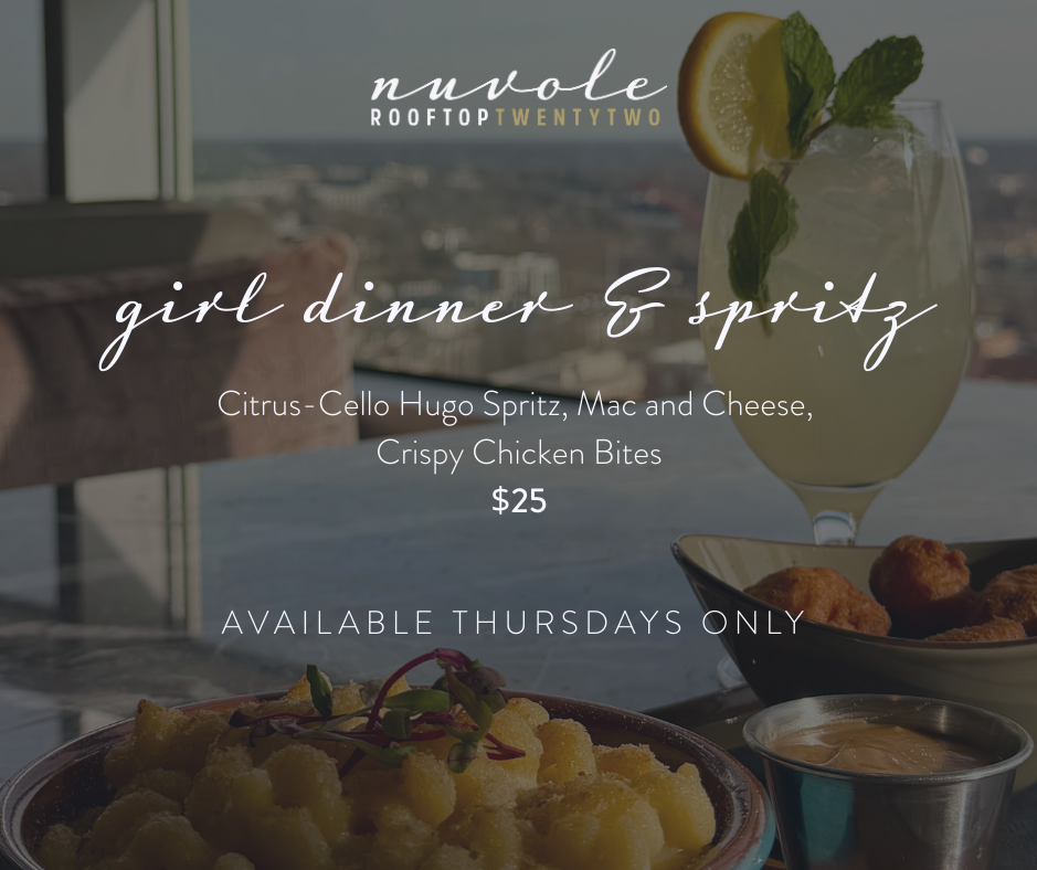 Thursday nights just got refreshed. From 4 – 11 PM, enjoy the ultimate trio: a Citrus-Cello Hugo Spritz, creamy Mac & Cheese, and Crispy Chicken Bites for just $25. And no — it’s not only for girls. This weekly special is for anyone who appreciates elevated comfort and skyline views. Join us every Thursday and see for yourself.